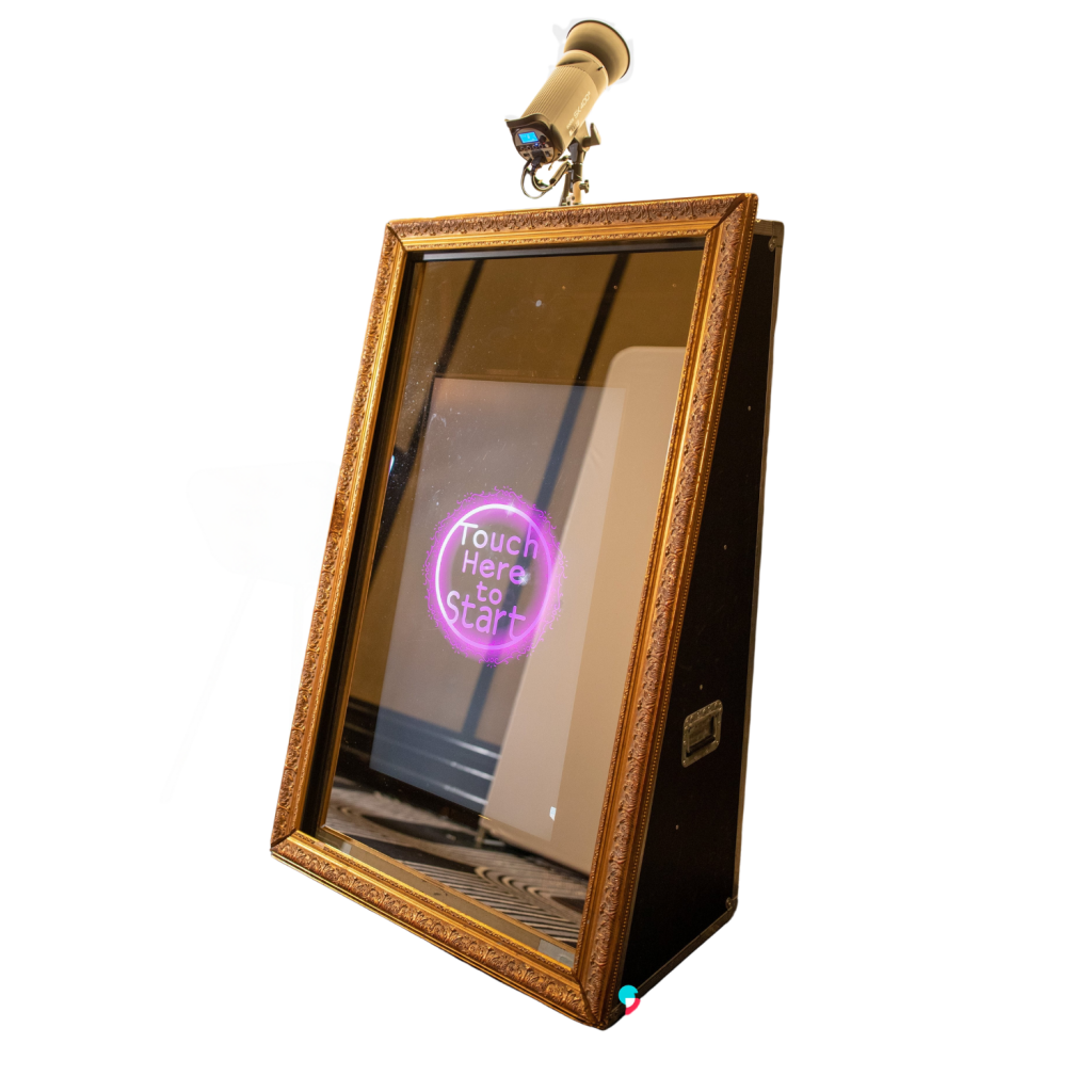 Interactive mirror photo booth with touch screen interface, instant printing, and social media sharing capabilities